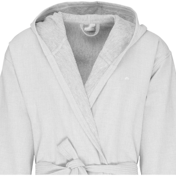 100% coton biologique. Coloris Navy et White 100% coton. Coloris Linen Grey : 95% coton / 5% viscose. Maille Terry. Toucher agréable et doux. Grande capuche. 2 poches côté plaquées avec surpiqûre de renfort en haut de poches. Ceinture avec passants. Lien d’accrochage dans le col. Finition double aiguille bord capuche, bas de manches et de vêtement. Finition tubulaire à l'ourlet bas et bas de manche. Certifié STANDARD 100 by OEKO-TEX® N° CQ 1007/6, IFTH.
